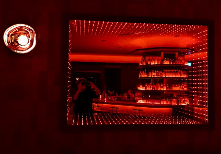 ディナーのあとは地下のナイトラウンジ「Red.」へ。エレベーターを降りると、そこには看板、バーカウンター、鏡までも赤い照明で染まった異空間が広がり驚かされます。