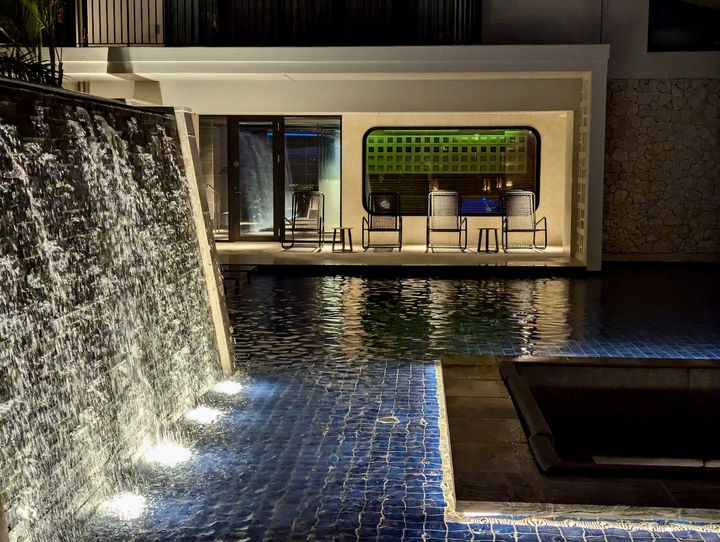 「シーサーサウナ」隣には水温の異なる水風呂が用意され、キンキンの冷水が苦手な人もトライしやすい環境。夜にはサウナ前のプールや滝がライトアップされ幻想的な雰囲気に一変します。