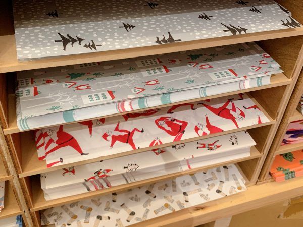これからの季節はやっぱりクリスマスラッピング。一年間のうち、この時期が一番の繁忙期だそうです。 シンプルなものから可愛いサンタまで様々なデザイン並んでいます。