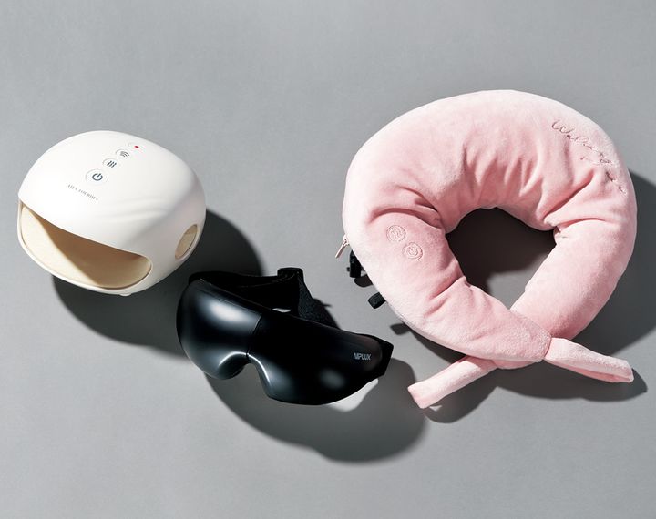 首の曲線に沿うウェーブ状のもみ玉が、首筋を両側からはさみ込んで心地よくマッサージ。揉み速度は3段階。温め機能あり。入眠の邪魔をしない静音設計。15分で自動オフ。¥9,900(アテックス)
