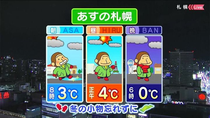 あすは朝より夜の方が寒く、夜6時は0度です。手袋やマフラーなど防寒アイテムを忘れないで下さい。
