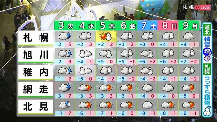 4日(水)以降は日本海側で雪の日が続きます。札幌では積もってはとけてを繰り返しますが、道北ではどんどん積雪が増えていきそうです。