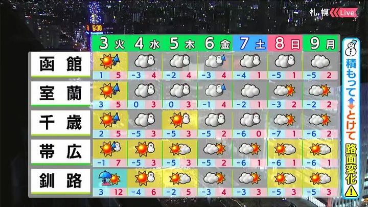 道南は雪で、函館では軽い雪かきが必要な日が多くなります。道東でもあす朝と水曜の午前中はうっすら積もるところがあるでしょう。路面状況の変化に注意して下さい。