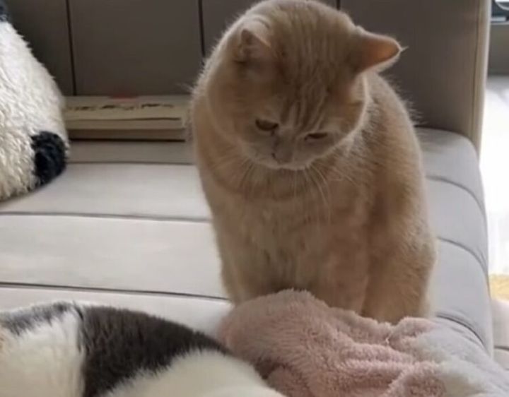 3. 「それ、いいなぁ」寝ている友達猫の毛布が羨ましくなっちゃって