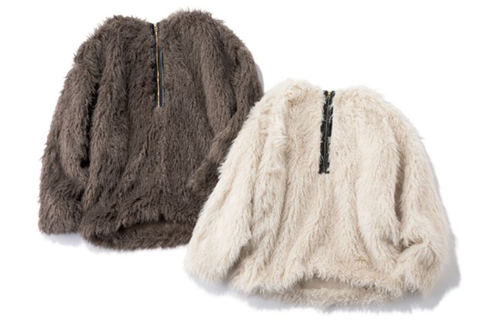 毛足の長いエコファー素材に、ハーフジップをエコレザーのパイピングであしらったトップス。アウター代わりにも。両脇はポケット付きで、手洗い可能。