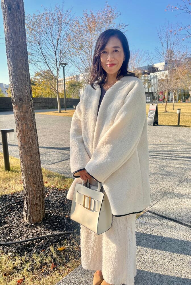 【50代スナップ】寒さも吹き飛ぶ!フワフワ素材の「レプシム」のコート&「ビス」のスカートで、気分の上がるホワイトコーデ