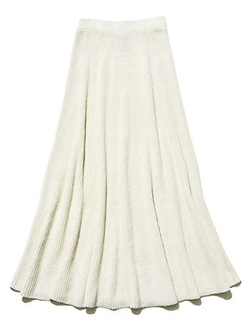 白スカート/カオス(カオス表参道) 軽やかなイメージから一変、ニットによる重みで迫力が増した白のスカート。ニットながら気品を残せる、シルクの糸を贅沢に使用。すそだけに広がりが出る落ち感とドレープでスタイルアップにも効果を発揮。フラットなウエストまわりで、見えたときもキレイ。