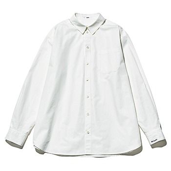 白シャツ/KUNIKO_NEMOTO×NAVE(NAVE) インナーを仕込んでも窮屈に感じない適度なゆとりがありながら、ルーズには見せないシルエット。お尻を隠しつつタックインがしやすい丈であるのも魅力。左のそで口に小さく入った「It’s so you!」の刺しゅうがさりげないハズしに。
