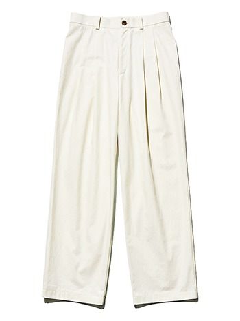 白チノパンツ/SEA(エスストア) 細身のシルエットだと緊張感を伴う白パンツは、メンズライクなワイドでカジュアルダウン。透けない程度に厚みのある生地によって、気になる膨張感まで軽減。足首にゆとりがあるため、ブーツなどとも好相性。ツータックが功を奏してのっぺり見せない立体感を。