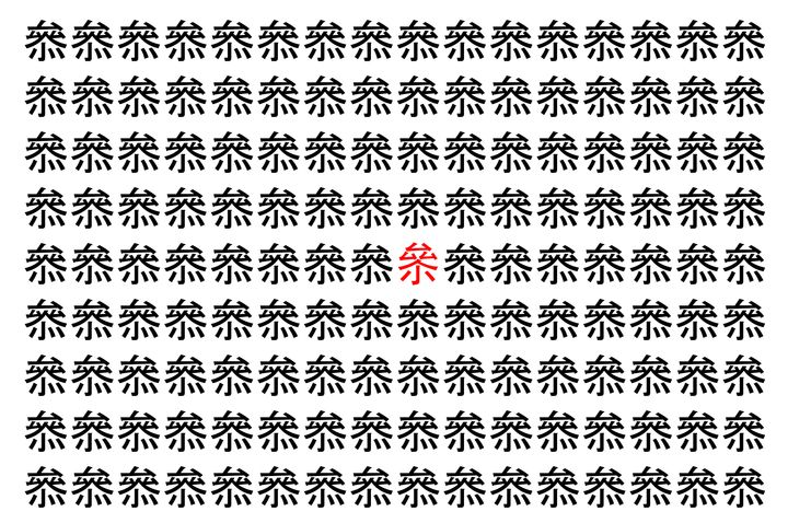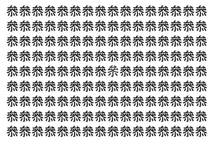 画像の中には、「叅」という漢字が縦に9行、横に16個並んでいます。 全部で144個となりますが・・・、そのうち1つは「異なる漢字」となってますよ!!