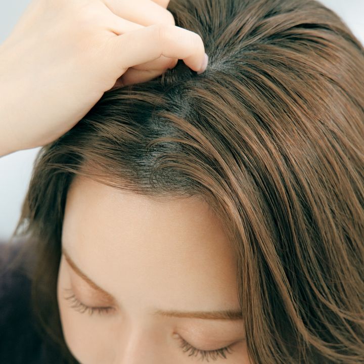 2.頭頂部の分け目の髪を小指の先であえてジグザグに分けとり、根元をふんわり立ち上げると、生え際の白髪が目立たなくなります。