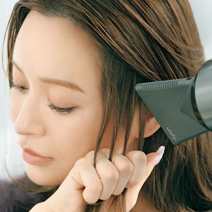 1.髪を乾かす際に耳から前の髪を前方向に引っ張って乾かします。耳上やこめかみのグレーヘアを見せないよう顔を包み込むように毛流れを。