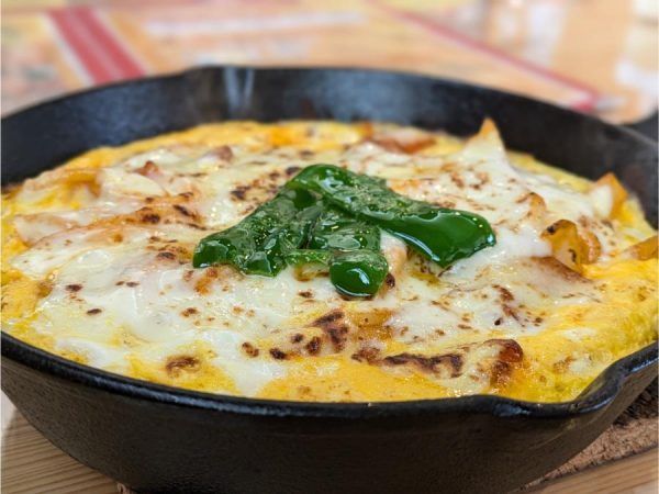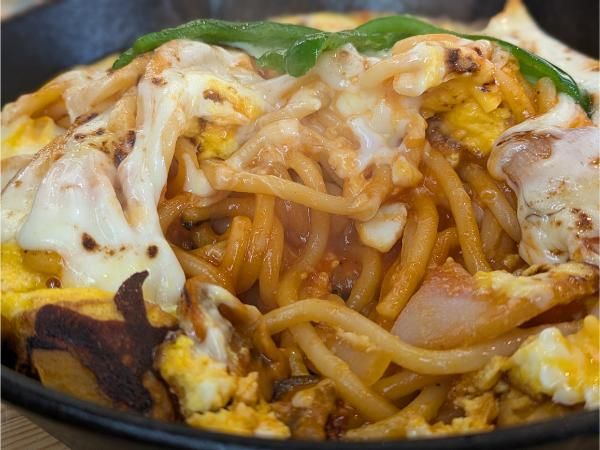たっぷりのチーズと卵をかき分けると、中からアツアツのおいしい湯気が!鉄板の醍醐味であるカリカリの食感が堪能できます。甘めの飽きのこない味つけと、いろんな食材のバランスのよさで、最後のひと口までおいしくいただくことができました。上に乗ったピーマンのシャキシャキ感もいいアクセントになっています。