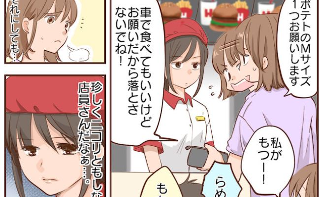 「コップ……?」と疑問に思い、私がその店員さんの顔を見ると、「あ、すみません!」と焦った様子で、「コップにポテトを分ければ、お子さんたちが車でケンカせずに食べられるかと思ったのですが、いりませんでしたか……?」とおずおずと聞いてきました。