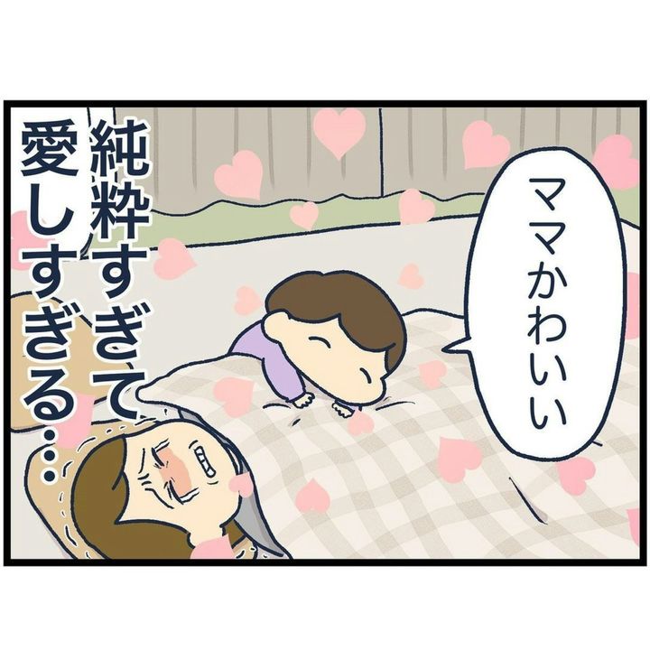 寝ているママをじっと見つめて、顔のパーツを一つ一つ指さして「かわいい」だなんて…みよちゃんの行動がかわいすぎます!一日の終わりにこんな出来事があったら、疲れも吹き飛んでしまいそうです。心が洗われますね。