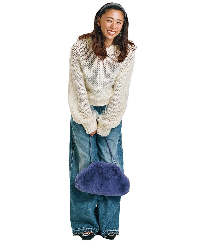 デニムパンツ¥38,500(TELA/ティースクエア プレスルーム)ニット¥16,940(メゾンスペシャル/メゾンスペシャル 青山店)バッグ¥12,650(アダム エ ロペ/ジュンカスタマーセンター)パンプス¥31,900(ツル バイ マリコ オイカワ)カチューシャ¥22,000(アレクサンドル ドゥ パリ/アレクサンドル ドゥ パリ GINZA SIX店)ピアス¥26,400(アナプノエ/フォーティーン ショールーム)ネックレス¥49,500(カラットアー/イセタンサローネ 東京)