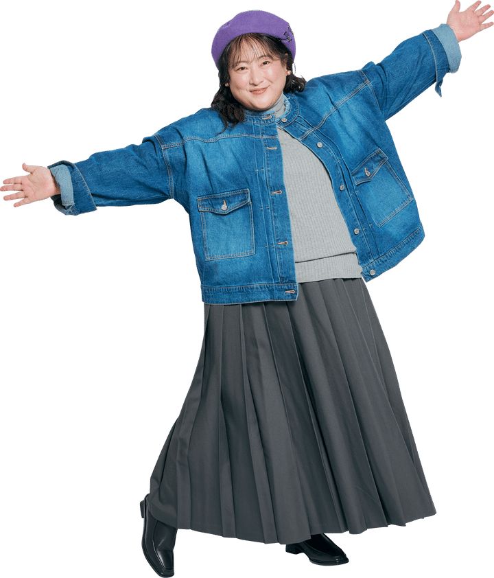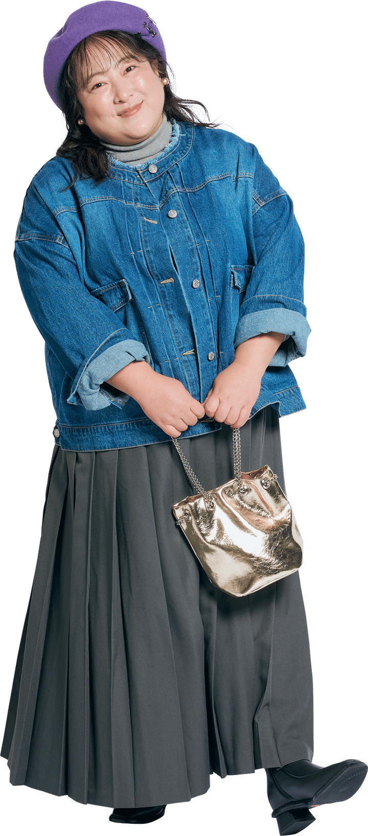 ショルダーバッグ ¥1,799/GRL プリーツマキシスカート L~10L ¥9,889~¥10,879、プルオーバー M~10L ¥6,589~¥7,249/共にCHIC STYLE(スマイルランド) ジージャン S~4L ¥7,150/リブ イン コンフォート(フェリシモ) ベレー帽 ¥12,320/CA4LA(CA4LAプレスルーム) ピアス ¥2,090/LIMITED NUMBER(お世話や) ショートブーツ 22~25cm ¥34,100/卑弥呼