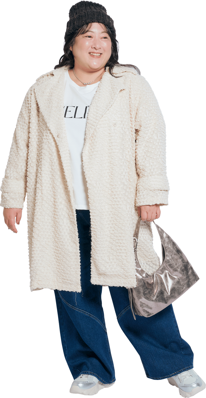 モコモコ感がかわいいコートはレースジャカードでお上品。ここにあえてのニット帽やデニムを合わせることでカジュアルダウンして、簡単に今っぽい着こなしに仕上がります。