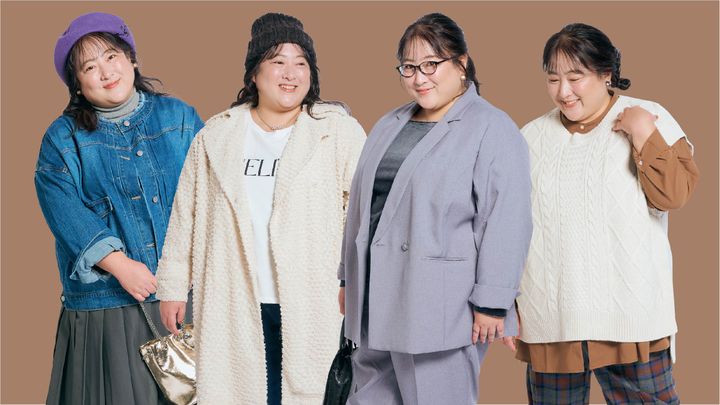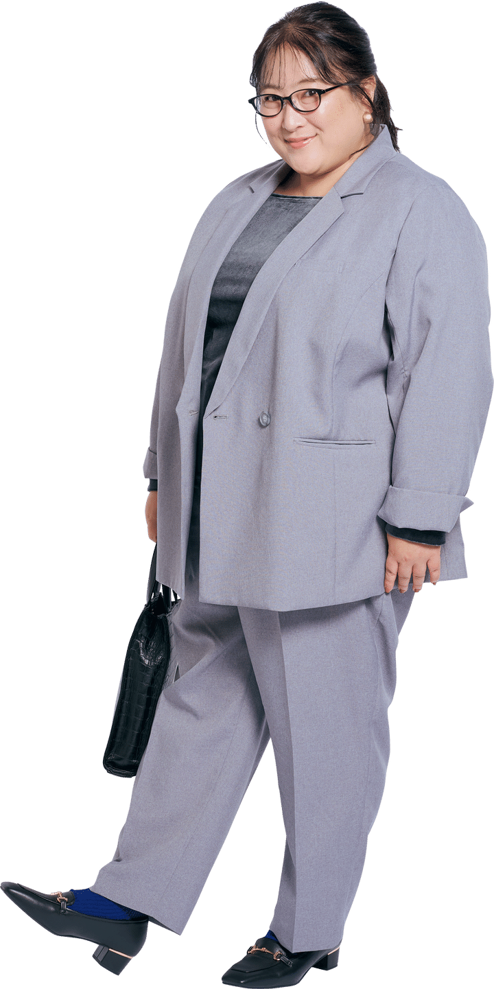 パンツスーツ S~8L ¥14,190~¥17,490/ニッセン ベロアプルオーバー 3L~5L ¥3,410/クレット メガネ ¥41,800/トニーセイム(トニーセイムジャパン) ピアス ¥2,640/LIMTED NUMBER(お世話や) ミニバーチカルトートバッグ ¥27,800/BajoLugo(FatherR) ソックス ¥660/靴下屋(Tabio) ローファー 22~26cm(以下WEB限定)21.5、26.5cm ¥7,700/ダブルエーオリエンタルトラフィック(ダブルエー)