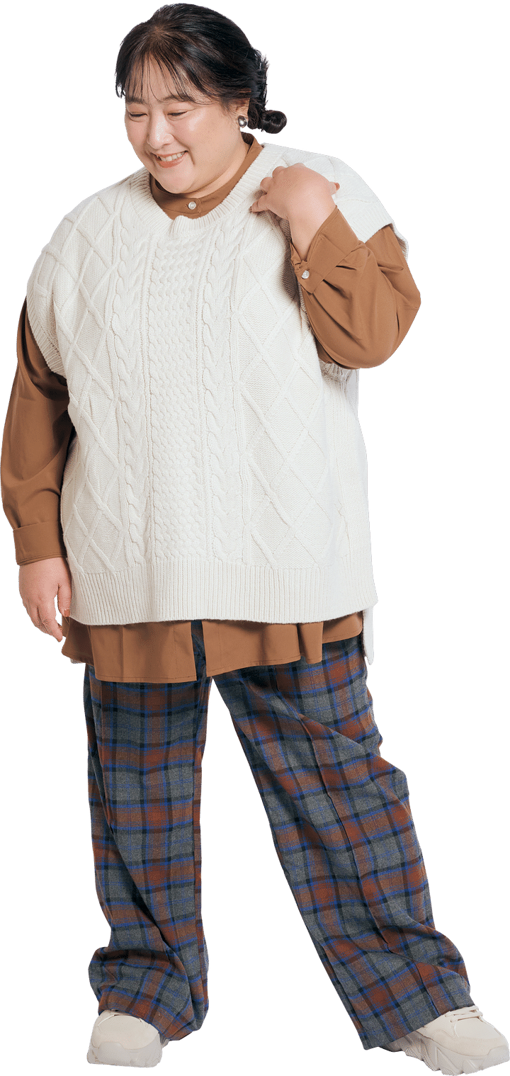 チェックパンツ L-LL~5L-6L ¥3,490、ニットベスト LL-3L~6L ¥7,990/LUMFORLE produced by My:nia(共にA HAPPY MARILYN) バンドカラーシャツ L~10L ¥3,839~¥4,279/スマイルランド イヤリング ¥5,250/アビステ