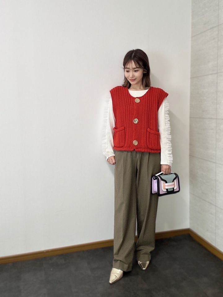 オリーブカラーは秋冬らしい色で気に入っています。今季は赤が最も気になるカラーなので、相性の良いオリーブのワイドパンツと合わせXmasや季節感をイメージしてみました。赤の挑戦コーデも、落ち着いたカラーのオリーブでカジュアルダウンできてお気に入りです。