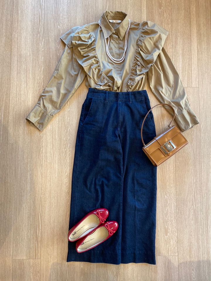 茶系×ブルーデニムで秋を意識しました。こちらのデニムはストレッチもあり、ウエストの後ろもゴムになっていて楽に履けるのにシルエットがとてもキレイなので、色違いで購入! ボリューム感のあるフリルブラウスをインしても、幅のあるウエストのシルエットが綺麗に収めてくれます。赤のバレエシューズを差し色にし、コーデにメリハリをつけたのもポイント。甘めのブラウスにカジュアルなデニム合わせは最近好きなスタイルです。