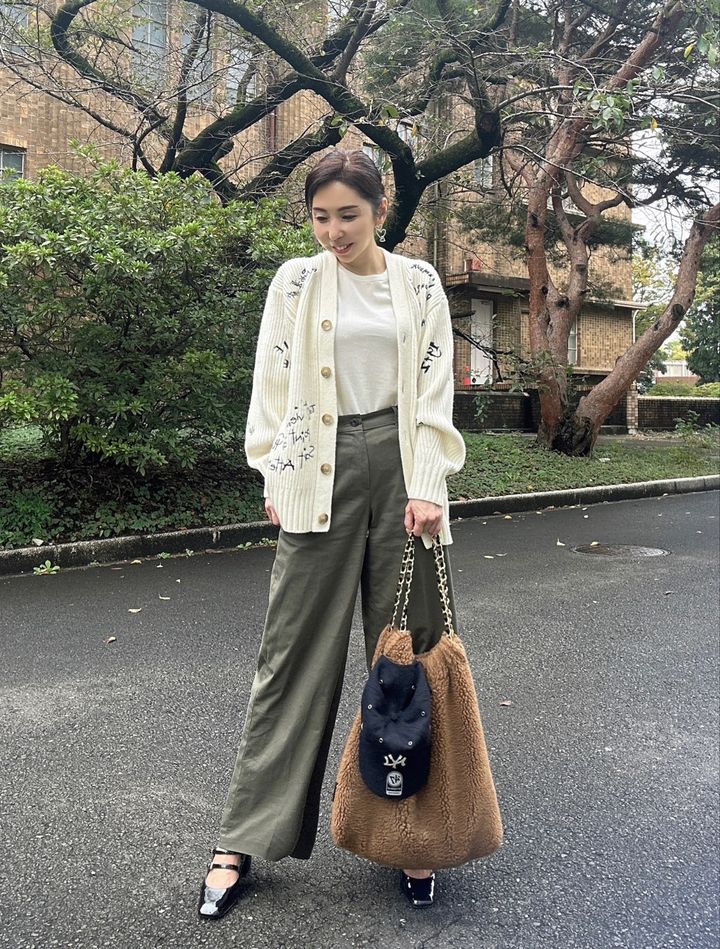 ワイドのチノは、キレイ目にもカジュアルにも合わせやすくてとても重宝しています。カーキのパンツは秋めいた小物ともよく合うので、ちょっと個性のあるものに合わせるとより良い雰囲気に。文字の入ったカーディガンやボアのバッグなど、キャッチーなアイテムで盛ってもカーキのパンツならまとまりよく受け止めてくれます。カーキ色がカジュアル要素が強い分、足元はストラップヒールを合わせてキレイ目に仕上げました。