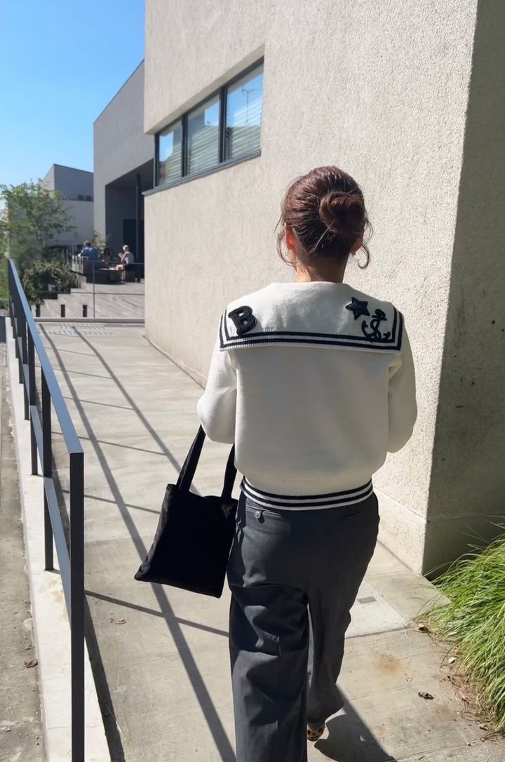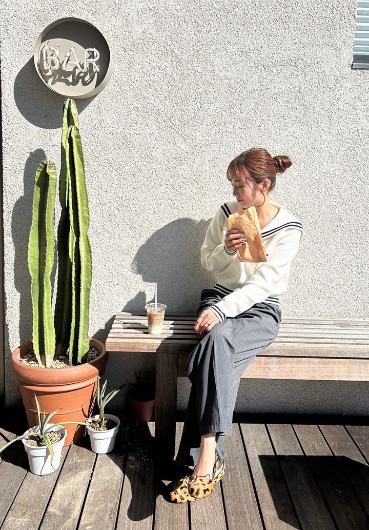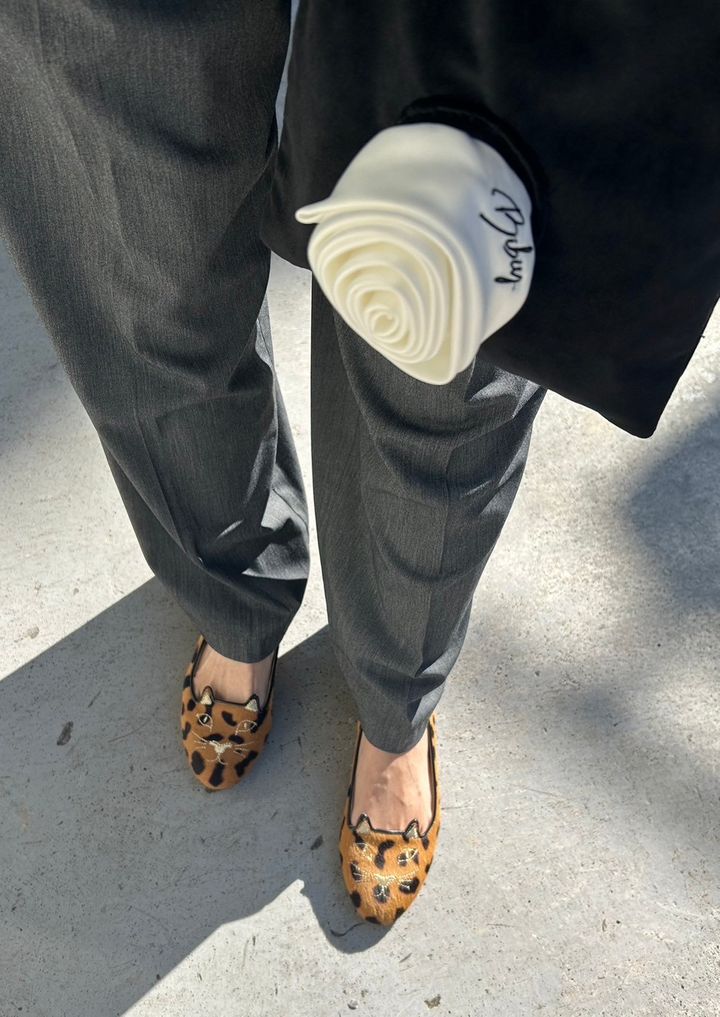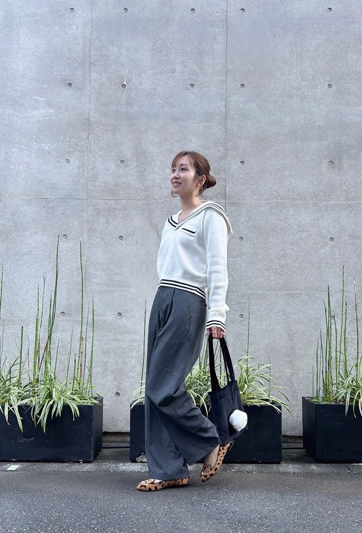 グレーはどんなカラーアイテムとも相性がよく、大人っぽく着こなせるので今ハマっている甘ニッシュコーデをしたい時によく手に取ります。今回はデザイン性と遊び心のあるお気に入りのセーラーカラーのニットを合わせ、甘さとカジュアルさをミックスしたスタイルに。後ろのワッペンもポイントになり、コーデに抜け感が出ます。バラのモチーフのバッグを合わせてモノトーンを意識しつつ、足元は豹柄のネコパンプスで華やかさをプラスしました。