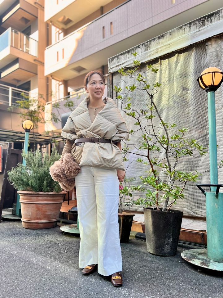 ユニクロのホワイトデニムは厚手素材で下着も透けにくく、寒さ対策に優れた優秀アイテム。この秋ブルーデニムと色違いで購入し重宝しています。ホワイトデニムにベージュ系のアイテムを合わせることでグラデーションを作り、まとまりのある仕上がりに。ボリュームのあるダウンマフラーにベルトでウエストマークし、メリハリをつけてこなれ感を出しました。