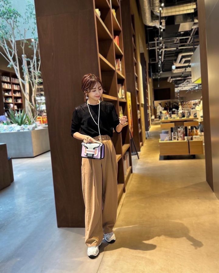 上品なベージュは公園のカジュアルコーデにも、学校行事のキレイ目コーデにも合わせやすい万能カラー。定番カラーだからこそ頼れるパンツで、ブラック×ベージュのシンプルコーデに。カラフルなバックでアクセントを足しました。2色買いしたレースクルーネックセーターもタックワイドパンツと相性抜群。トップスがレース素材なので、ゴツめスニーカーを合わせてカジュアルダウンしています。