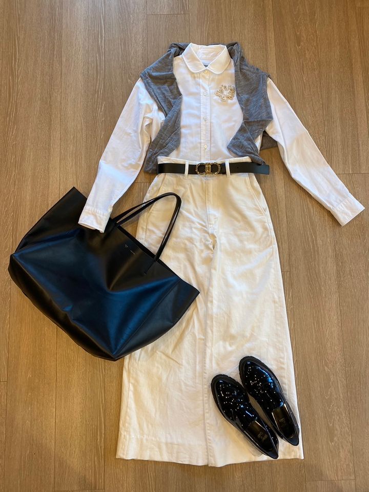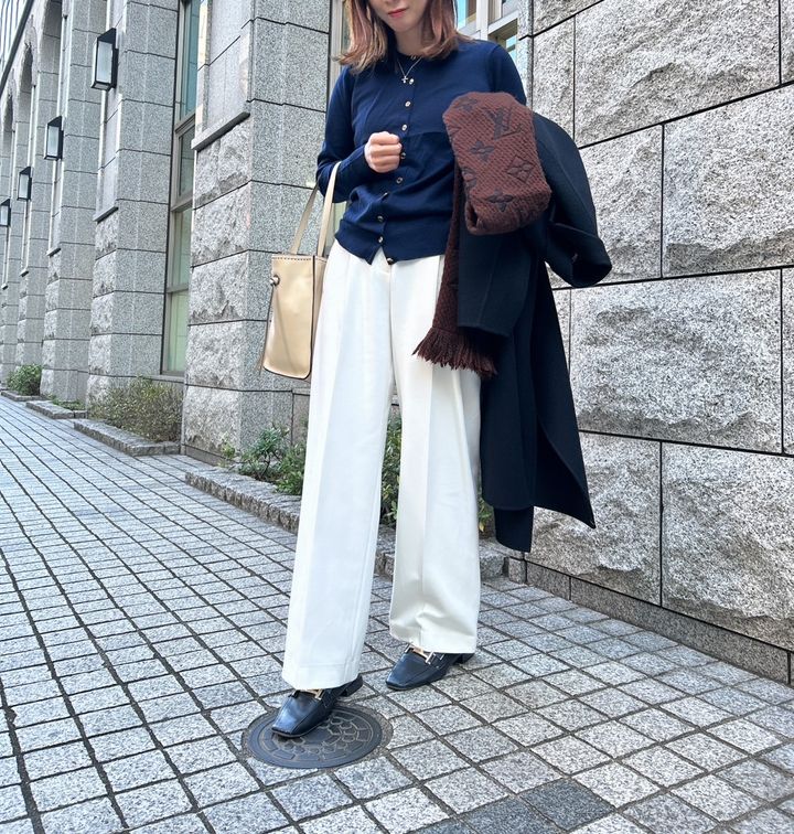 カジュアルにも綺麗めにも使えるので通勤の時にも出番が多いタックワイドパンツ。ローファーとブラウンストールで、トラッドで大人っぽいイメージに仕上げました。白は何にでも合わせやすく、優しい印象に近づけるので重宝しています。着回し力抜群なので通勤服として色違いで着回しています。