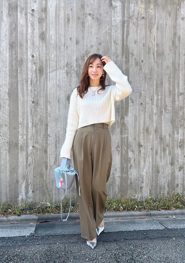 タックワイドパンツはハイウエストのワイドシルエットなので、ショート丈のトップスとも相性抜群! シンプルなカーキと白ニットの組み合わせには、ブルーのバッグとシルバーパンプスの差し色で色味を足しました。パンプスに合わせてアクセサリーもシルバーにして全体に統一感を。