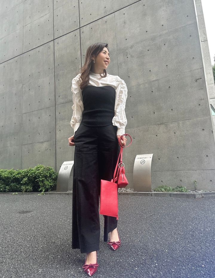 黒のワイドチノパンツは、ビスチェを合わせれば、すっかりお出かけ仕様に。太すぎない、スッキリとしたラインのパンツでスタイル良く見えるので、ここぞというお出かけにもぴったりです。モノトーンコーデに小物の赤で差し色効果も抜群! 小物を変えて遊べば色々な雰囲気のコーデが楽しめるので、カジュアルにもキレイ目にも、どんな場面でも大活躍のパンツです。