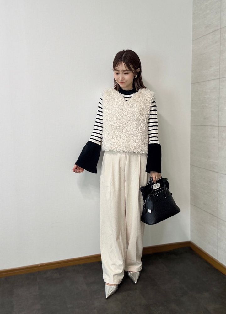タックワイドパンツのホワイトは、白すぎず合わせやすいナチュラルなカラーで、どんな色のアイテムでも受け止めてくれるので出番が多いアイテムです。白のファーベストを合わせて上下ホワイトワントーンコーデながらも素材違いで立体感を。さらにボーダーニットをインし、メリハリを効かせたモノトーンコーデに仕上げました。
