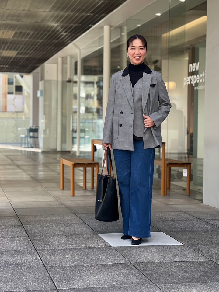 デニムにパンプスとジャケットを合わせてキレイ目に着るのが私流。40代に入ってから家着感が強まり手に取ることが少なくなっていたデニムですが、ワイドトラウザージーンズは、からだのラインを拾わないラインとセンタープレスがカジュアル感を抑えてくれ、脚長効果もあるのでお気に入りです。かっちりアイテムを合わせて、お出かけスタイルを意識しました。おじジャケとおじベストを重ねてトレンド感を盛り込めば、今どきスタイルを楽しめます。
