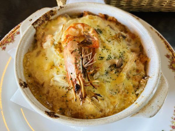 見るからにあったかそうな熱々ドリアのうえにくるんとのったおいしそうな海老。