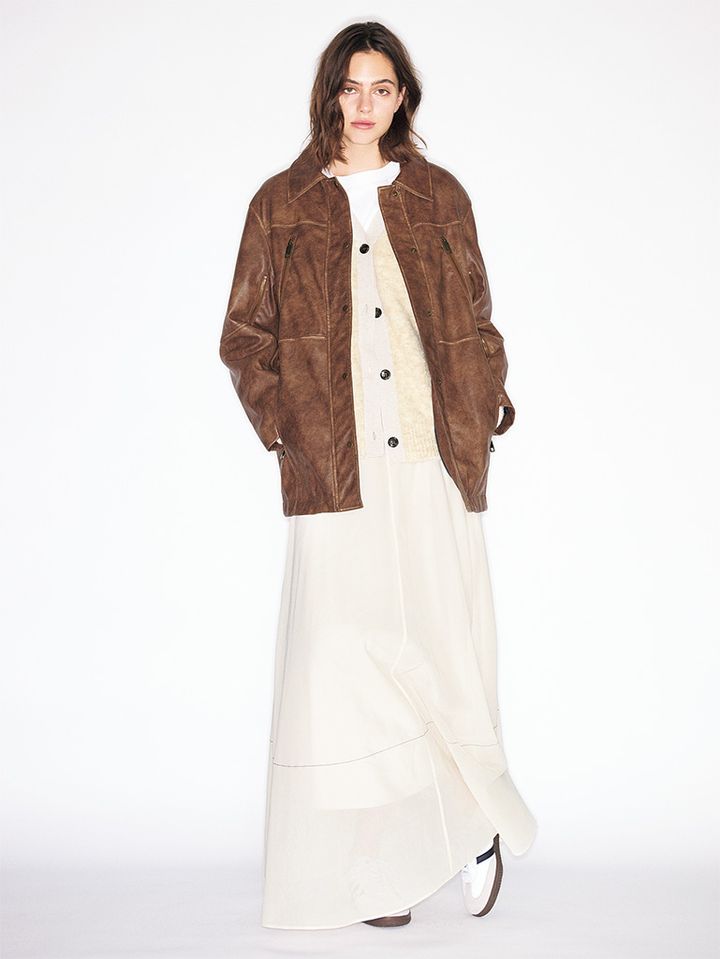 【POINT】アイボリーのカーディガンとスカートとでつくった柔和なワントーンにもなじみやすい、ゆったりめのブラウン。パンプスではなくスニーカーを合わせることでジャケットだけが浮かず、キレイとカジュアルがつり合うバランスに。