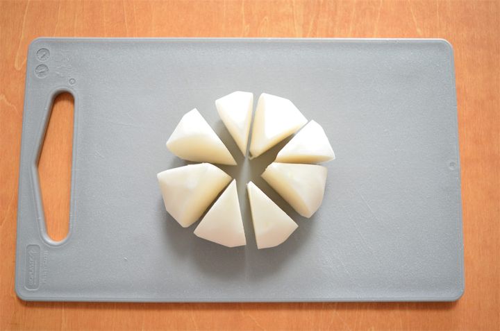 1.かぶは皮を剥き、大きいものは1個を12等分、中くらいのものは8等分のくし切りにする。