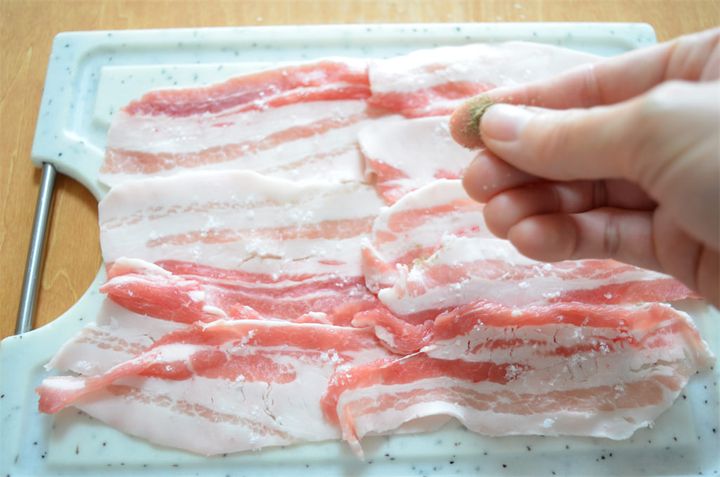 2豚バラ肉を広げて、全体に塩、こしょうをふる。