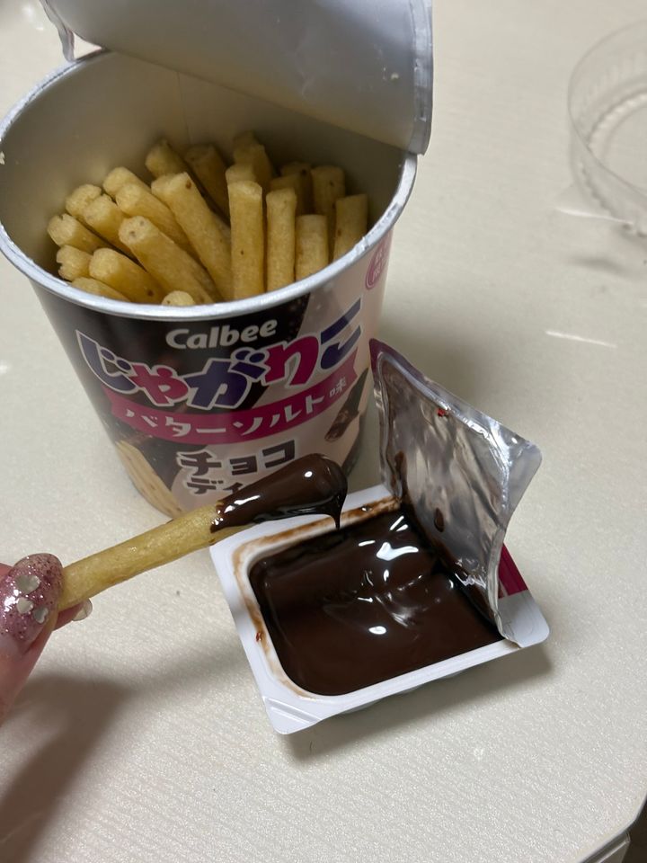 なんとじゃがりこにチョコソースがついてる‼️初めて見て、即買いでした笑