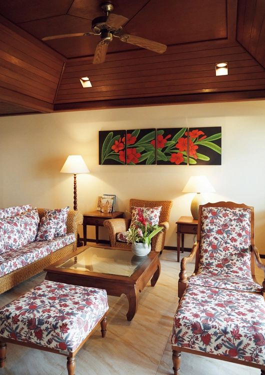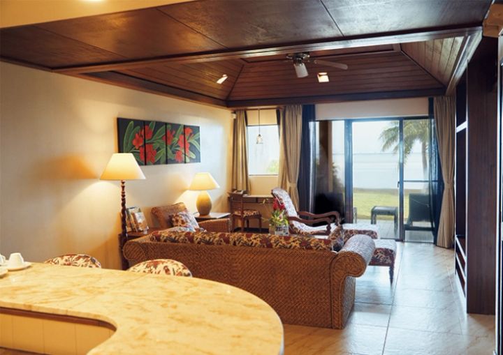 ベッドルームとは別に広々としたリビングルームでリラックスタイム。内装もTHE南国な感じがGOOD。ミニバーも付いていて実用度もバッチリなんです。