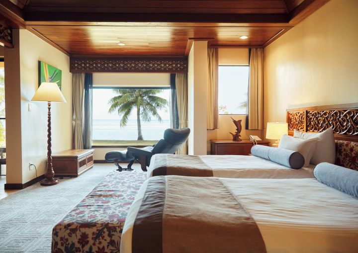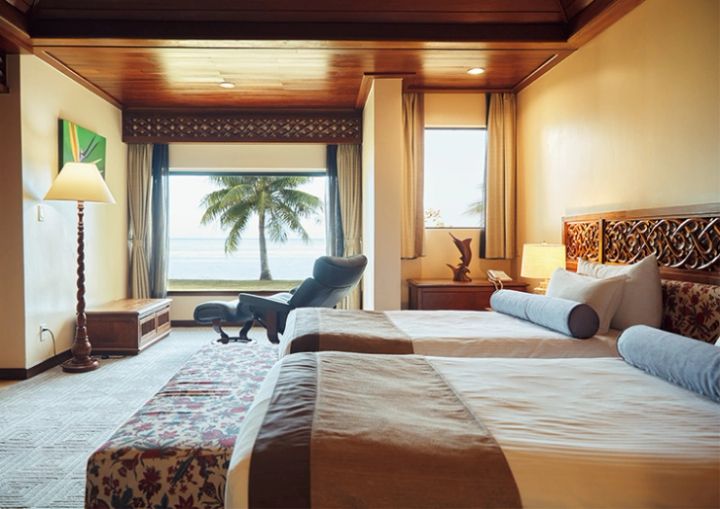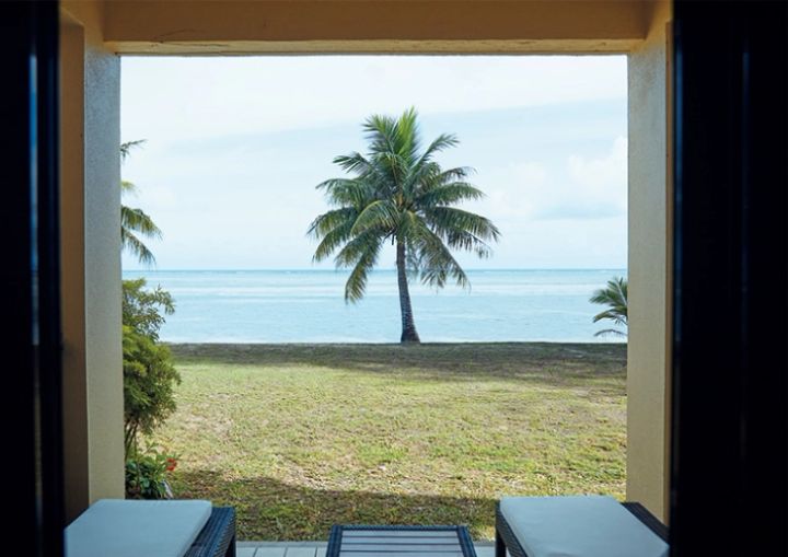こちらの客室「デラックスオーシャンフロント6号棟」では美しいアチュガオビーチが目の前に広がります。1Fだとベランダからすぐビーチに行くことができるのも◎。
