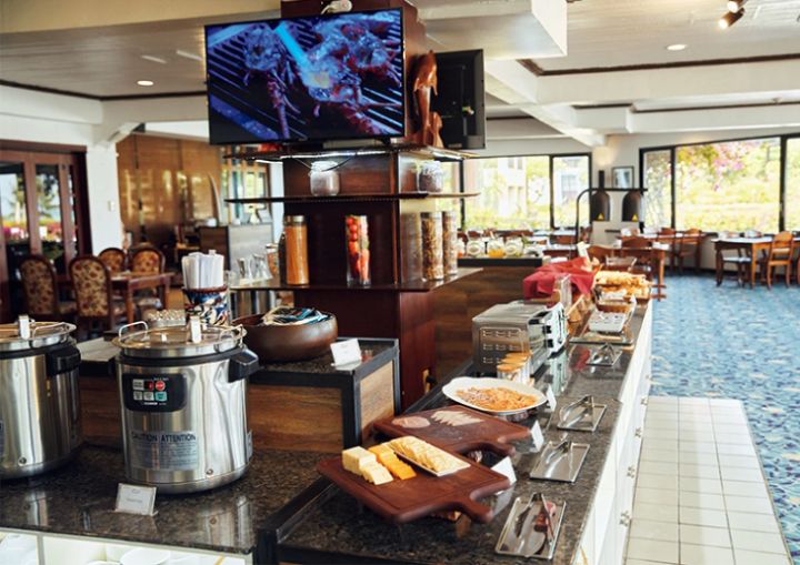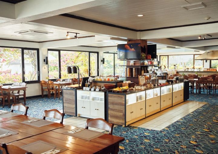 ビーチとホテルのプールが見渡せる「コスタテラスレストラン」。毎朝食と日替わりテーマの異なるランチビュッフェ、週末のディナービュッフェを提供しています。朝食に日本食も用意されているのが嬉しい。テラス席もあってそちらでは水着での利用もOK!