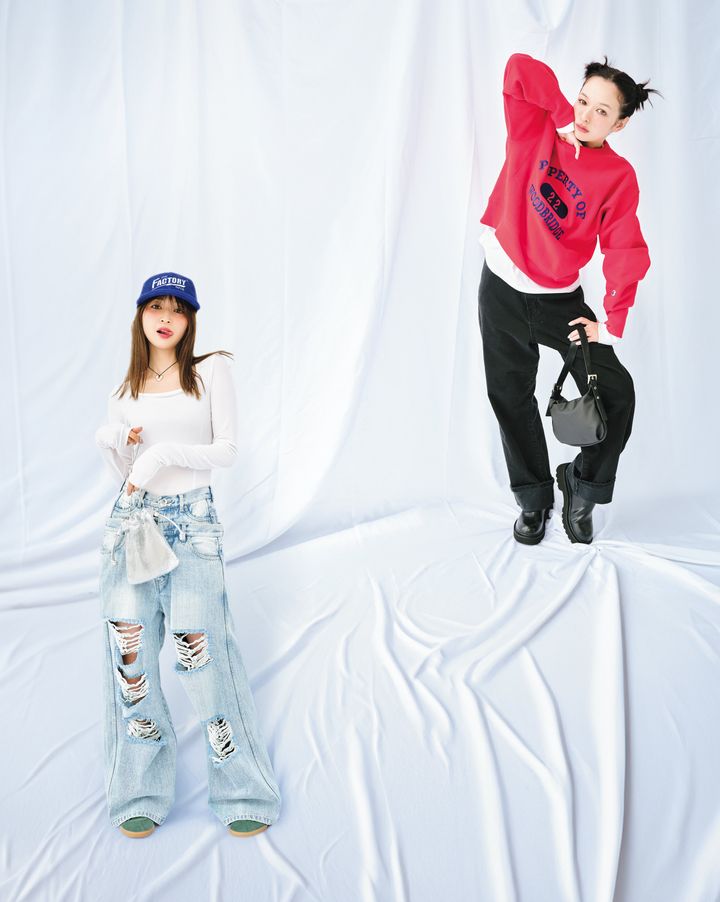 森絵梨佳、上西星来。ar10月号より (右)デニム¥14,300/サムシング(エドウイン・カスタマーサービス)スウェット¥12,210/ベーセーストック別注チャンピオン(ベーセーストック 新宿)中に着たロンT¥7,700/アングリッドバッ¥12,230/ヨミム(ハナ)ブーツ¥14,900/チャールズ&キース(チャールズ&キース ジャパン)(左)デニム¥22,800/ザ・トゥートップス¥7,999/H&M(H&M カスタマーサービス)キャップ¥8,470/ザ ファクトリー メイド(中央帽子)チョーカー¥16,500/アニカイネズ(レイ ビームス 新宿) バッグ¥6,990/マンゴ(ロコンド)スニーカー¥15,400/アディダス オリジナルス(アディダスお客様窓口)