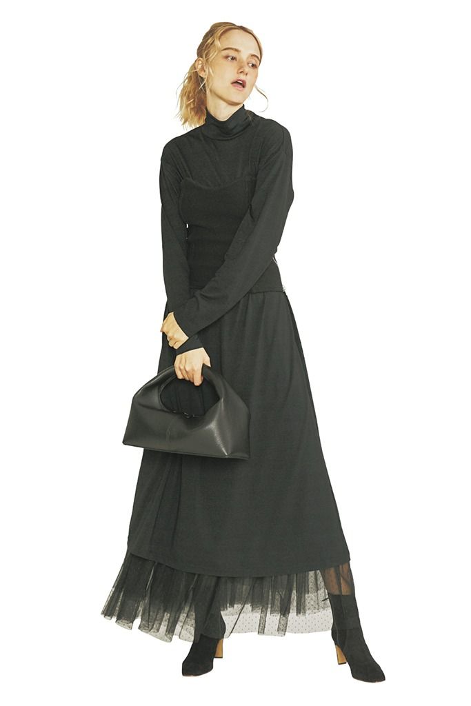 体のラインが変わる同色の別アイテムを足すと、ワンピースの印象を保ったまま気になる間のびをセーブできる。ビスチェだけでなく、質感違いのフレアスカートを下にしのばせれば、ゆるやかなくびれが出現。しっかりと厚みのある編み地のニットビスチェ。軽い印象のチュールを下に仕込んで立体感を。 ワンピースは着まわし。ビスチェ/アンヌーク チュールスカート/RANDA バッグ/フランツロアー(シップス インフォメーションセンター) ブーツ/ダイアナ(ダイアナ 銀座本店)