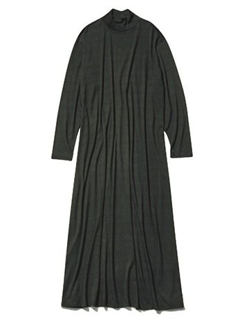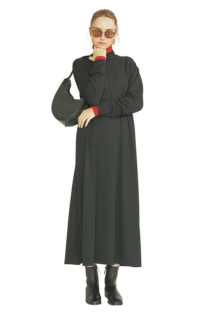 カットソー感覚で着られる、薄手のニットワンピース。足首がのぞく丈を選ぶと間のびを防ぎ、足元の変化を楽しむこともできる。折り返さなくてもキレイに立つネックの高さと、体のラインを拾いすぎない適度なゆとり。 黒ワンピース/グラフペーパー(グラフペーパー 東京)