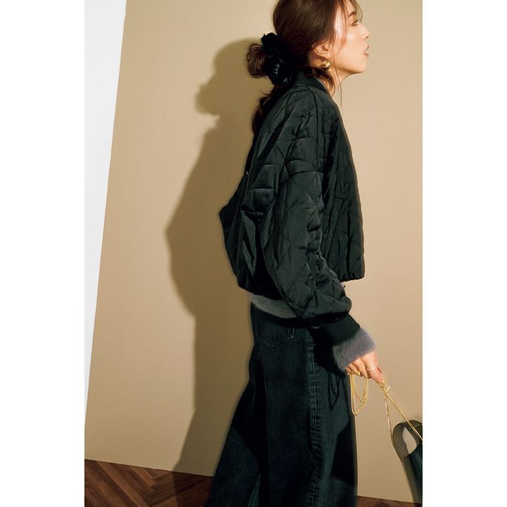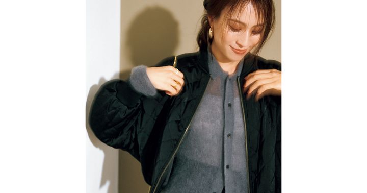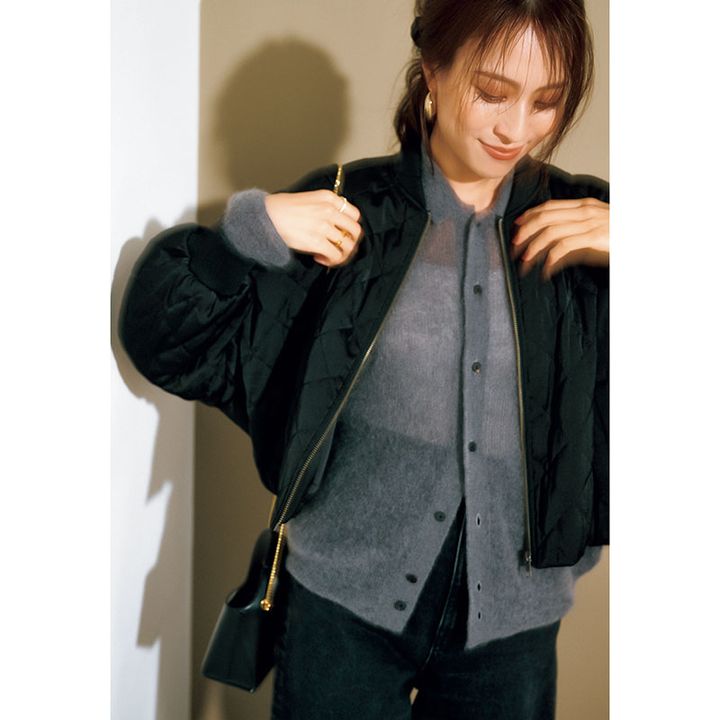 キルティングジャケット¥32,890(リネイヴ/オンワード樫山お客様相談室)ニット¥60,500(エイトン/エイトン青山)デニムパンツ¥11,000(ミラオーウェン/ミラオーウェンルミネ新宿2 店)ピアス¥3,800リング(人差し指)¥3,740〈ともにKRONOS〉(薬指)¥9,200〈vihod〉(すべてロードス)バッグ¥29,700(トーヴ/アンソロジー)