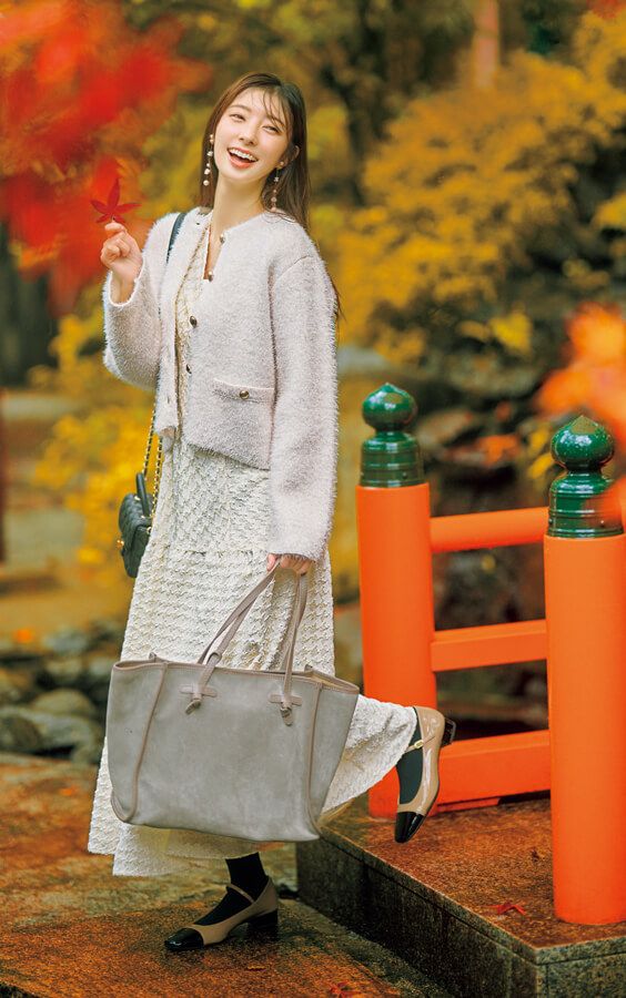 シャギーニットジャケットとジャガートワンピの質感が温もりを感じさせるオールホワイトコーデは、色鮮やかな紅葉の風景をバックに写真映えをお約束。