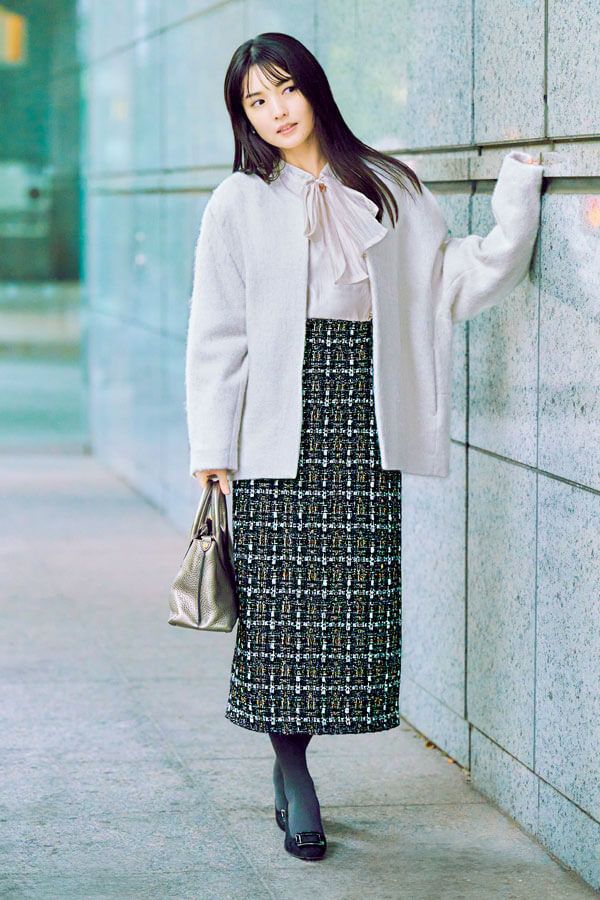 今季はオーバーサイズなアウターがトレンド。ペンシルスカートを合わせて下半身をコンパクトにまとめれば、ボリュームアウターもすっきり見え必至。インナーに仕込んだ大きなボウタイで小顔効果も期待大。