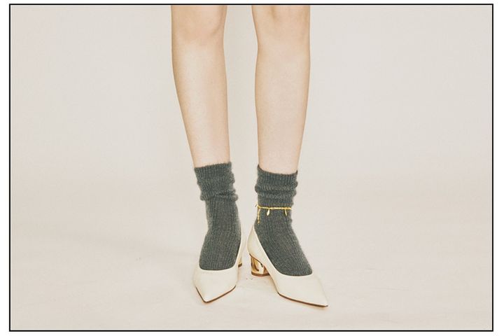 グレーソックス/GLORIA CORDES(フレームワーク ルミネ新宿店) アンクレット/SOKO(ZUTTOHOLIC) ホワイトパンプス/STACCATO(バロックジャパンリミテッド) ふわふわとした毛並みをキレイにシフトさせる華奢なゴールド。暗い色のソックスでムードが沈んでしまいそうなときの方向転換に最適。